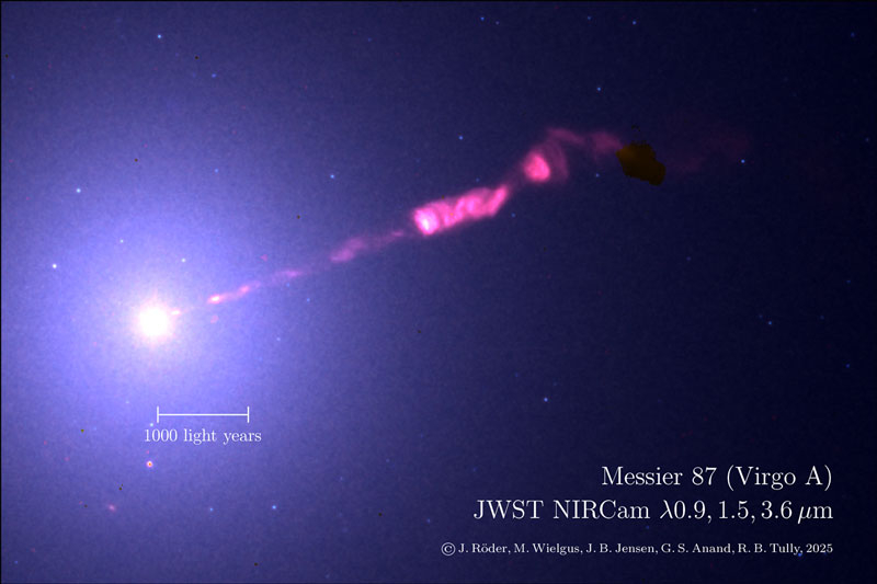 «Джеймс Уэбб» запечатлел во всех деталях джет чёрной дыры M87* — «световой меч», длиною в тысячи световых лет ; «Вселенная — это ускоритель для бедных», — когда-то сказал академик Яков Борисович Зельдович. Отчасти это так — естественным образом в небесах происходят вещи, для лабораторного воспроизведения которых требуются колоссальные затраты, но даже деньги не решают всего. Зато решают передовые инструменты наблюдения за космосом, что снова доказала обсерватория им. Джеймса Уэбба, создав самое детальное в истории изображение джета чёрной дыры. Источник изображений: Astronomy and Astrophysics 2025