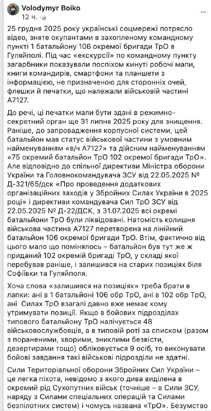 Россияне смогли захватить батальонный командный пункт в Гуляйполе из-за массового дезертирства ВСУ и больших потерь в силах теробороны. Такое мнение высказал демобилизованный из армии журналист Владимир Бойко. Он пишет, что в ТрО «давно некому» держать фронт. Бойко сообщает, что через несколько часов после захвата россиянами командного пункта в из оборонявшей этот участок 102-й бригады дезертировали более 70 военных, а через пару дней еще два десятка. «Причина не является тайной: 102 отдельная бригада ТрО давно «стёрта» и с таким некомплектом личного состава не способна выполнять боевые задачи. За неделю до массового дезертирства бригаду было решено, наконец, вывести из зоны боевых действий на восстановление боеспособности — дать людям отдохнуть и получить хотя бы какое-то пополнение. Но из-за катастрофической ситуации на фронте перед 18 декабря поступил новый приказ: никакого отдыха, всех снова направить на позиции. Бойцы, когда об этом узнали, просто сели в автомобили и уехали домой», - рассказал Бойко. «Ни в 1 батальоне 106 обр ТрО, ни в 102 обр ТрО, ни в Силах ТрО (которые отвечали за этот участок обороны в Гуляйполе - Ред.) вообще уже давно некому удерживать позиции. Если в боевых подразделениях типового батальона ТрО насчитывается 48 военнослужащих, а в типовой роте по списку (вместе с ранеными, больными, пропавшими без вести, дезертирами и т. д.) числится 9 человек, то выполнять боевые задачи такие воинские подразделения не способны», - написал Бойко. «Батальоны ТрО ВСУ — это, пожалуй, самые истощённые и измотанные войной подразделения ВСУ. Но именно от их боеспособности в первую очередь зависит, насколько далеко противник продвинется вглубь Украины. Потому что только пехота удерживает территорию… И именно поэтому боевые потери ТрО, комплектование ТрО по остаточному принципу и массовое дезертирство пехоты являются тремя компонентами поражения Украины в войне с Россией», - заявляет журналист. По его словам, сейчас ТрО пополняется исключительно принудительно мобилизованными, «которых, как собак, отлавливали на улице, которые не успели сбежать по дороге из учебного центра к месту службы и у которых не было денег, чтобы откупиться от ТЦК или хотя бы купить себе тыловую должность в ВСУ». Бойко добавляет, что каждый день из украинской армии дезертирует более тысячи военнослужащих» Это означает, что армии нет и восстановить её уже невозможно — точка невозврата пройдена. Поэтому на примере Гуляйполя каждый может спрогнозировать, по какой границе Украина будет подписывать акт о капитуляции», - пишет журналист. Он считает одной из причин массового дезертирства то, что мобилизация не касается «привелигированных» украинцев. «На фронте никто не собирается умирать ради того, чтобы капитан ВСУ Вакарчук ездил по заграницам с концертами, младший лейтенант (уже стал офицером!) НГУ Жадан выступал на корпоративах или на открытии XXVII Конгресса Украинской ассоциации футбола, старший сержант (!) ВСУ Шабунин был прикомандирован к киевским генделикам, младший лейтенант НГУ Кипиани нёс тяготы службы в музее прессы, военнообязанный Стерненко покупал элитную недвижимость, а военнообязанный Лещенко развлекался в роли диджея в ночных клубах. Таких, как Шабунин или Вакарчук, в ВСУ уже не десятки, а сотни тысяч: при миллионной армии реально на фронте нах