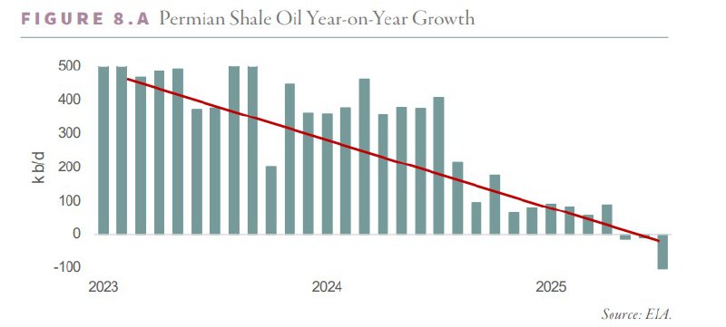 Вопреки расхожему мнению о «неизбежном нефтяном профиците», картина начинает выглядеть совсем иначе. Поставки нефти в США близки к переломному моменту: по оценкам ING Commodities, уже в 2026 году чистое предложение сырой нефти в США может уйти в отрицательную зону. Одновременно сокращаются резервные мощности ОПЕК, а ОПЕК+ уже снижает добычу второй месяц подряд – в ноябре и декабре. На этом фоне спрос в США растёт значительно быстрее ожиданий: он более чем вдвое превышает прогнозы МЭА. Следить стоит и за экспортом в начале 2026 года – поставки из Казахстана, вероятно, останутся низкими, экспорт Ирака может сократиться, чтобы новые скважины в США были экономически оправданы, цена на нефть должна составлять около $60-70 за баррель. Всё это постепенно «съедает» тот самый предполагаемый избыток предложения. Ключевая тема ближайших лет – завершение роста добычи вне ОПЕК. Американская сланцевая отрасль, которая обеспечивала около 90% мирового прироста добычи, впервые в истории показывает отрицательную динамику год к году. При цене около $56 за баррель WTI производство в США не растёт даже при расширении крупных компаний: к концу 2026 года прогноз – около 12,8 млн баррелей в сутки, что примерно на 1 млн ниже текущих уровней. Причина системная. Сланец характеризуется высокими базовыми темпами падения – около 40% в год, что эквивалентно примерно 3 млн баррелей в сутки глобальных потерь, то есть почти половине всех мировых естественных спадов добычи. Пока индустрия маскирует проблему за счёт бурения всё новых высокодебитных скважин поверх старых, но этот приём не бесконечен. Исторически нефтяные «бычьи» циклы начинались именно тогда, когда истощение начинало опережать ввод новых мощностей: в 1970-х после пика традиционной добычи в США, в 2000-х – после спада в Северном море и Мексике. Сегодня таким триггером может стать сланцевая нефть. Если добавить сюда экологические и инфраструктурные ограничения сланцевой модели, а также риск одновременного заметного падения добычи у двух крупнейших производителей мира, вероятность жёсткого баланса на рынке к концу 2026 года выглядит выше 50%. Единственный фактор, который может отсрочить этот сценарий, – глобальная рецессия. Главный вопрос остаётся открытым: если сланцевая нефть больше не способна компенсировать естественное падение добычи, то кто сможет это сделать? @banksta