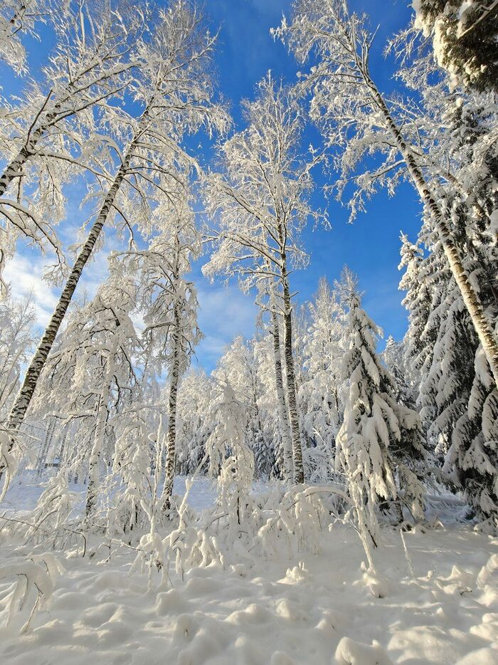 Зимний снежный лес и замёрзшие озера. Утром первого числа я пошла гулять часа на два. На улице не было никого из-за сильного мороза и первого числа. Я немного отморозила нос, но это стоило того. Так как вышло солнце и после обидно выпавшего снега виды захватывали дух. А снежинки были все красивые.