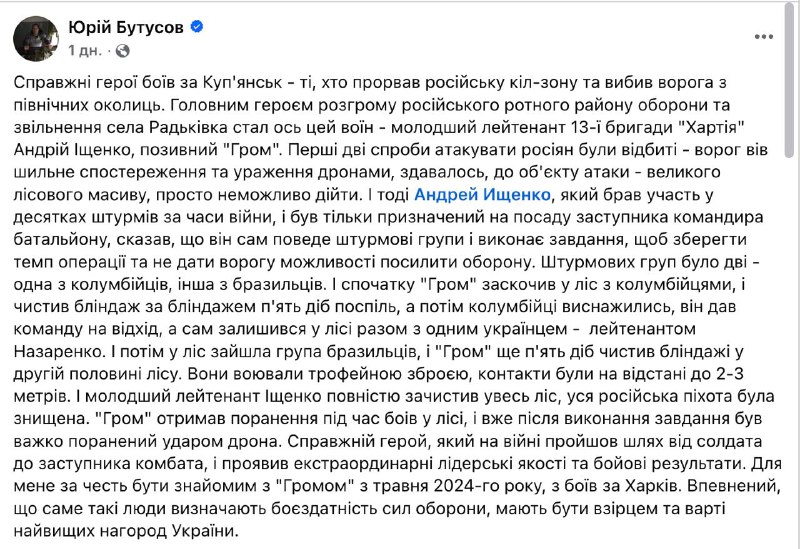 Решающую роль в контрнаступлении украинских войск на Купянск сыграли бразильцы и колумбийцы, следует из слов главреда «Цензора» Юрия Бутусова, который сейчас воюет в бригаде Нацгвардии «Хартия». Он рассказывает историю заместителя комбата 13-й бригады «Хартия» Андрей Ищенко («Гром»), который вместе с бразильцами и колумбийцами, воюющими за Украину, 10 суток подряд зачищал лес под Купянском. «Штурмовых групп было две – одна из колумбийцев, другая из бразильцев. И сначала "Гром" заскочил в лес с колумбийцами и чистил блиндаж за блиндажем пять суток подряд, а потом колумбийцы истощились, он дал команду на уход, а сам остался в лесу вместе с одним украинцем - лейтенантом Назаренко. И потом в лес зашла группа бразильцев, и "Гром" еще пять суток чистил блиндажи во второй половине леса. Они сражались трофейным оружием, контакты были на расстоянии до 2-3 метров», - пишет Бутусов. Отметим, что командир бригады «Хартия» Даниэль "Куба" Китоне - украинец кубинского происхождения. Ранее появлялось немало сведений о том, что на стороне Украины воюет много выходцев из Латинской Америки. Основная мотивация - деньги. В связи с этим парламент Колумбии даже принял законопроект о борьбе с наемничеством. Сайт "Страна" | X/Twitter | Прислать новость/фото/видео | Реклама на канале | Помощь