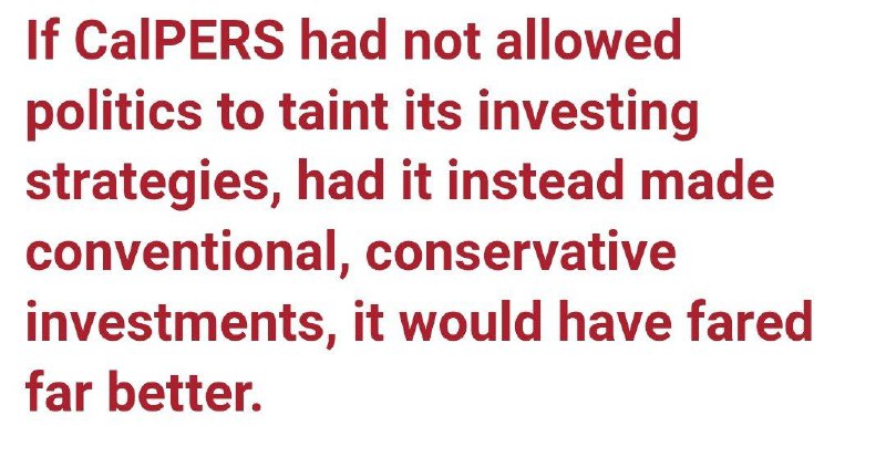 Политизированные инвестиции пенсионных фондов США уже обходятся в миллиарды потерь. CalPERS, крупнейший пенсионный фонд США с активами более $450 млрд, в последние годы активно увеличивает долю ESG-инвестиций. В одном из случаев фонд потерял 71% из $468 млн, вложенных в частный инвестиционный фонд, который ориентирован на чистую энергетику и технологии. Несмотря на катастрофические убытки, фонд отказался предоставить подробности об их причинах. Общие потери могли составить до 3% потерь от таких инвестиций или около $13 млрд. Пенсионный фонд Teacher Retirement System of Texas (TRS) с активами около $180 млрд инвестирует в экологически чистые и социально ответственные проекты. В 2020 году такие вложения снизили доходность фонда на 3%, что означало потерю около $5,4 млрд прибыли, которые могли бы использовать для выплат пенсионерам. Пенсионный фонд Нью-Йорка с активами более $250 млрд также увеличил долю ESG-инвестиций. Согласно расчётам, эти вложения снизили доходность на 2% в год, что при таких суммах привело бы к недополучению до $5 млрд ежегодно. @banksta
