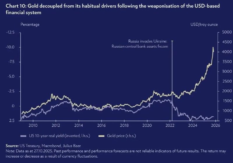 Доллар оказался в уязвимой позиции после того, как заморозка российских активов стала основным инструментом давления. Это разрушило Бреттон-Вудскую систему, которая ранее делала доллар неотъемлемой частью мировых резервов, приравнивая его к золоту. Ранее держатели американских облигаций могли спокойно полагаться на их стабильность, поскольку доходность по ним была схожа с доходностью от золота, а инфляция и незначительные проценты легко компенсировались обслуживанием долга. Теперь же оказалось, что активы на сотни миллиардов долларов можно просто заморозить по решению одного человека, даже без должных объяснений или юридических оснований. Это встревожило инвесторов, и они начали выводить капиталы из американских облигаций, переключаясь на золото. Теперь доллар и US-Treasuries уже не воспринимаются как «безопасная гавань», а золото снова становится востребованным активом. @banksta