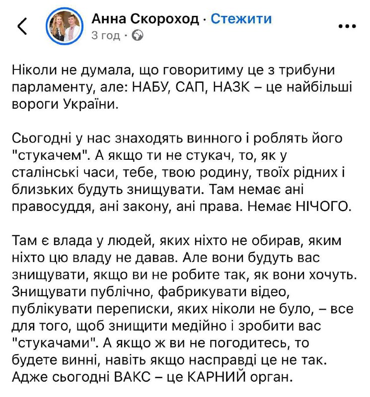 Нардеп Скороход, получившая подозрение от НАБУ, назвала этот и другие антикоррупционные органы - САП, НАПК и ВАКС - «самыми большими врагами Украины». «Сегодня у нас находят виновного и делают его "стукачем". А если ты не стукач, то как в сталинские времена, тебя, твою семью, твоих родных и близких будут уничтожать. Там нет ни правосудия, ни закона, ни права. Там есть власть у людей, которых никто не выбирал, каким никто эту власть не давал. Но они будут вас уничтожать, если вы не поступаете так, как они хотят. Уничтожать публично, фабриковать видео, публиковать переписки, которых никогда не было, – все для того, чтобы уничтожить медийно и сделать вас "стукачами". А если вы не согласитесь, то будете должны, даже если на самом деле это не так. Ведь сегодня ВАКС – это наказательный орган», - заявила Скороход. Напомним, сегодня НАБУ вручило подозрение Юлии Тимошенко, опубликовав пленки ее переговоров. Как сказали «Стране» депутаты, переговоры с ней записал нардеп от «Слуги народа» Сергей Кузьминых, который получил подозрение НАБУ еще в 2022 году после чего, по распространенному среди нардепов мнению, был завербован антикоррупционными органами. Сайт "Страна" | X/Twitter | Прислать новость/фото/видео | Реклама на канале | Помощь