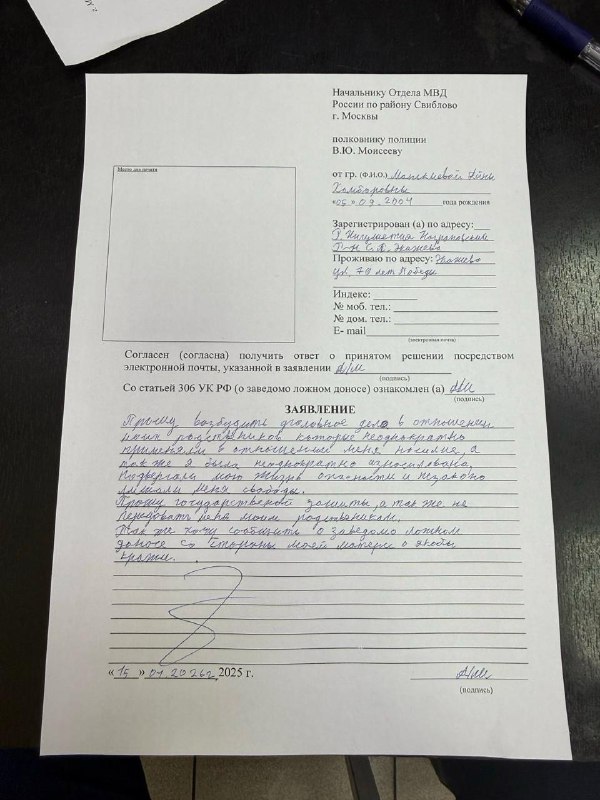 Обновлено: Айну выпустили из ОВД Свиблово. ___ В Москве задержали сбежавшую от родственников ингушку Айну Манькиеву. По данным правозащитников, с детства она подвергалась насилию и эксплуатации. Правозащитники из проекта «Марем» опасаются передачи Айны силовикам из Ингушетии Родственники объявляли её в розыск, но 21-летняя девушка сама с него снималась. Спустя восемь месяцев после побега, 14 января, Манькиеву задержали по подозрению в краже. По словам девушки, ложный донос на неё написала мать. Проект «Марем» также утверждает, что семья Манькиевой относится к баталхаджинцам — закрытой религиозно-общинной группе в Ингушетии. В конце 2022 года боевое крыло этой общины было признано террористической организацией. По данным проекта, силовики, беседовавшие с Айной в отделе полиции в районе Свиблово, «сами понимают опасность ее родственников». Правозащитники заявили, что Айна сообщила полиции о насилии со стороны родственников и потребовала возбудить против них уголовное дело. Девушка написала заявление на имя начальника отдела МВД, где провела всю ночь и находится до сих пор. В заявлении Манькиева указала, что родственники неоднократно применяли к ней насилие, подвергали ее жизнь опасности и лишали свободы. Девушка также сообщила, что её насиловали. «Прошу государственной защиты, а также не передавать меня моим родственникам», — написала Манькиева. В то же время у отдела полиции, где находится Айна, стали задерживать журналистов. О задержании своих сотрудников сообщили Ксения Собчак и SotaVision (минюст РФ считает иноагентом). По словам Собчак, задержание силовики объяснили написанным кем-то заявлением о том, что «у данного магазина собралась группа граждан с неизвестными целями». SotaVision пишет, что задержаны были несколько журналистов и подруга Манькиевой. Всех увели в участок «для проверки документов». Позже «Осторожно Media» и «Марем» сообщили, что Айну выпустили из ОВД Свиблово. Она покинула отдел вместе со своим адвокатом и сейчас находится в безопасном месте.