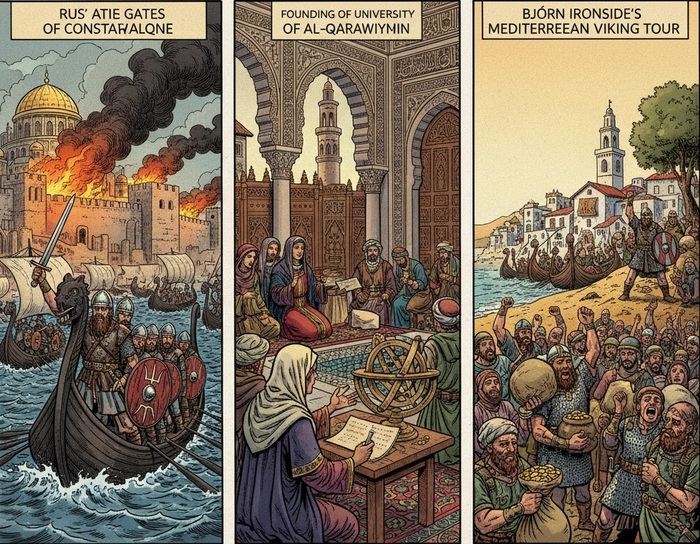 Лихие 800-е, Эпизод 6: Русы у ворот Царьграда, первый университет и «Викинг-тур» по Средиземноморью: Хроники 851–860 годов. Привет, Пикабу! 👋 В прошлых сериях (841–850): Франки окончательно распилили империю Карла Великого на три части (Верденский договор). Рагнар Лодброк (или кто-то очень на него похожий) вынес Париж, а арабские пираты напугали Папу Римского до икоты, разграбив Ватикан. Ну что, перевалили за экватор девятого века! Если в 840-х Европа только училась платить викингам «за спокойствие», а Китай плавил Будду на монеты, то в 850-х события начали уплотняться так, что искры полетели по всей планете....