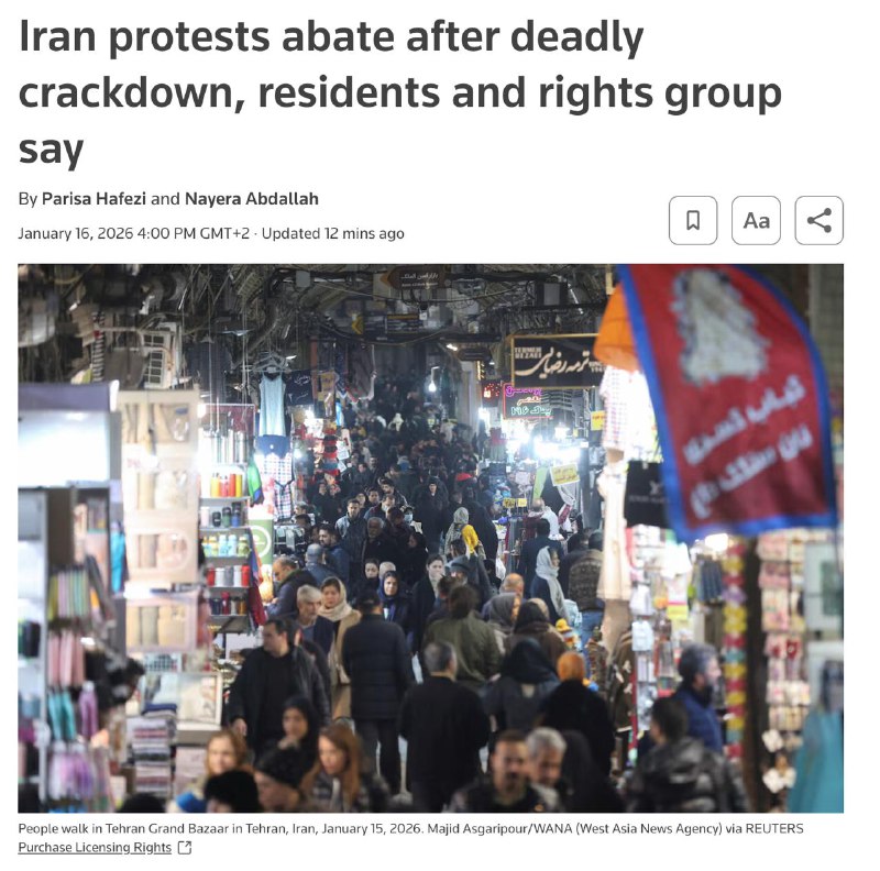 Жесткие действия властей Ирана, по всей видимости, к настоящему моменту в значительной степени подавили протесты. Об этом сообщает Reuters со ссылкой на правозащитные организации и местных жителей, подтверждая оценки «Страны». Несколько жителей Тегерана заявили, что в столице еще с воскресенья царит спокойствие. Они сказали, что над городом летают дроны, хотя в четверг и пятницу они не видели никаких признаков протестов. Государственные СМИ сообщили о новых арестах в пятницу на фоне неоднократных угроз США вмешаться, если убийства продолжатся. Ирано-курдская правозащитная группа «Хенгау» заявила, что с воскресенья протестных акций не проводилось, но «ситуация с безопасностью остается крайне ограничительной». «Наши независимые источники подтверждают значительное присутствие военных и сил безопасности в городах и поселках, где ранее проходили протесты, а также в ряде мест, где крупных демонстраций не было», — заявила базирующаяся в Норвегии организация Hengaw в комментариях агентству Reuters. Другой житель северного города на Каспийском море также отметил, что на улицах, по-видимому, спокойно. Однако в некоторых районах все ещё наблюдались отдельные поджоги и протестные акции, отмечает Reuters. По данным иранских источников, в ходе протестов погибли около 2000 человек. Тем временем в соцсетях публикуют видео, как утверждается, с улиц иранских городов, которые патрулируют усиленные отряды вооруженных силовиков. Сайт «Страна» | YouTube | Прислать новость/фото/видео | Реклама на канале