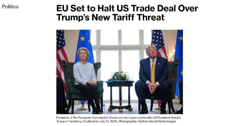 ЕС собирается остановить процесс заключения торгового соглашения с США из-за введения новых «гренландских» тарифов со стороны Трампа. Об этом пишет Bloomberg, ссылаясь на президента Европейской Народной Партии (ЕНП) Манфреда Вебера, партия которого является крупнейшей в Европарламенте. По словам Вебера, достижение соглашения с США больше невозможно. Речь идет о торговом соглашении, идея которого возникла между США и ЕС весной 2025 года, как реакция на введение Трампом жестких пошлин против стран Евросоюза. Теперь же, по мнению Вебера и депутатов ЕНП, введение новых пошлин делает предыдущее соглашение бессмысленным. "Если депутаты от ЕНП присоединятся к левым политическим группам, вероятно, у них будет достаточно голосов, чтобы отложить или заблокировать торговую сделку между ЕС и США, которая уже частично реализована, но еще нуждается в одобрении Европарламента. В результате последних действий Трампа по введению 10%-х пошлин против 8 стран из-за Гренландии заключение торгового соглашения стало еще более сложным процессом", - пишет Bloomberg. Как отмечает издание, группа влиятельных европейских парламентариев давно выступает против соглашения, заявляя, что оно слишком несбалансировано в пользу США. Это недовольство усилилось после того, как США распространили 50-процентную пошлину на сталь и алюминий на сотни дополнительных товаров из ЕС. В результате последних действий Трампа по введению 10%-х пошлин против 8 стран из-за Гренландии заключение торгового соглашения стало еще более сложным процессом, резюмирует Bloomberg.