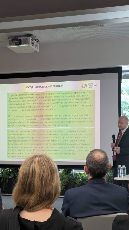 Мы когда говорим о том, что из недовольной тиграми общественности пытаются сделать врагов Родины, мы вот примерно что имеем в виду. Сергей Арамилев. Генеральный директор АНО «Амурский тигр». Лето 2025 года. Доклад в Московском зоопарке. И пусть горе-пиарасты только попробуют эту фотку объявить фейком — слишком много уважаемых людей, это видели и слышали. Наслаждаемся тезисами. Если ваше село тиранит тигр, а вы этим очень недовольны, — значит, это «враг продолжает активную работу в информационном поле». И пёселя вашего задрал, скорее всего, лично Джей Ди Вэнс, Мерц, Макрон и/или ЦИПСО. Вообще, как говорится: отрицаешь – предлагай. Вот мы и предлагаем. Нужно принять новый закон, по которому, как с дронами, любые сообщения о выходе тигра к людям должны строго караться штрафами. Потому что, как известно, если закрыть глаза/уши/рот и не видеть, не слышать и не говорить, значит никакой проблемы нет!