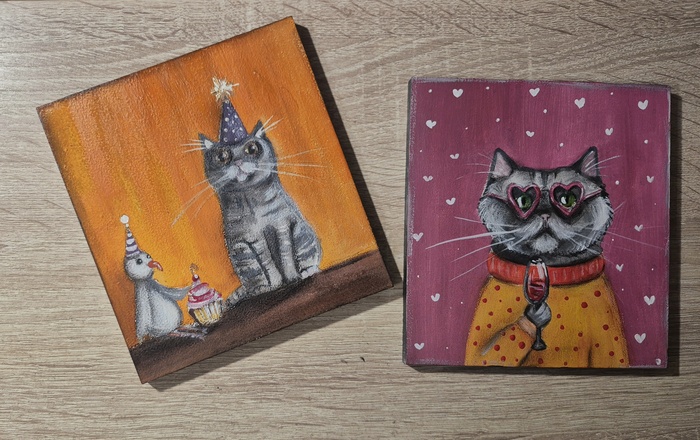Котосмешнявки продолжаются. Продолжаю работать над серией котоминиатюр и показываю, что получилось. (Розовый в жизни несколько светлее и более пудровый, но, как всегда, по фото сложно передать весь шарм и палитру. А ведь котики и шарм неразделимы). Был разговор про собак. Говорено, что маловато их на моём канале. Но уже скоро, совсем скоро исправлю ситуацию, и будет картина с собакой. Картина маслом и уже на сушке, но дело небыстрое, приходится ждать.🤷♀️