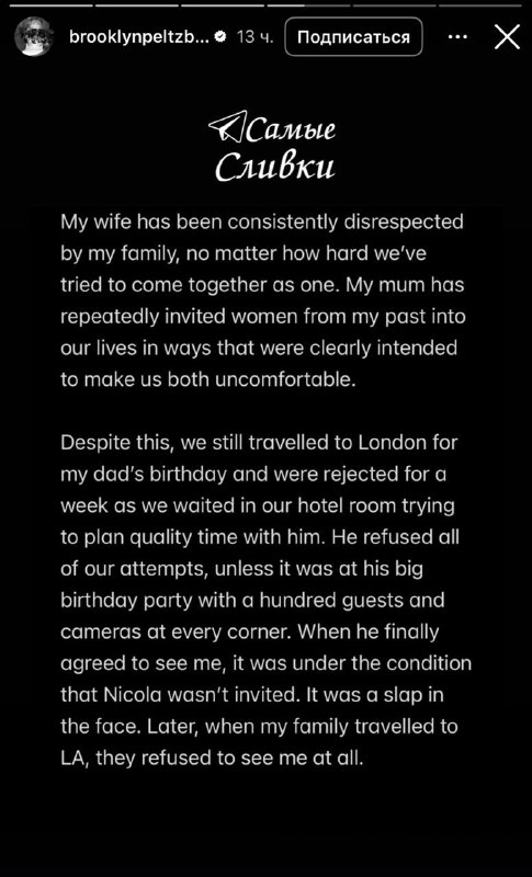 Скандал в благородном семействе, который долго зрел, наконец прорвался наружу. 26-летний Бруклин Бекхэм из-за жены публично отрекся от своих прославленных родителей. В соцсетях он опубликовал серию сторис с множеством текста, где унизил Викторию и Дэвида. Претензий у парня целый вагон: - Виктория постоянно унижала его жену Николу Пельтц и пыталась разрушить их отношения. В последний момент перед свадьбой она отказалась шить ей платье от собственного бренда, и наряд пришлось искать новый — - Вики буквально травила Николу, подстраивая встречи с бывшими девушками Бруклина — - на свадьбе мать украла первый танец молодоженов, выйдя сама танцевать с сыном. И это было очень «неприлично». «Меня в жизни так не унижали», пишет сын — - в семье Бекхэм пиар и публичное одобрение важнее всего, бренд на первом месте — - родители всю жизнь управляли сыном и только сейчас, заблокировав их везде, он чувствует покой и умиротворение. Лихо, конечно. Интересно, что будет, если Бруклин в итоге разведется. А уж как мы ждем ответ Вики, у которой сейчас знатно подгорает!