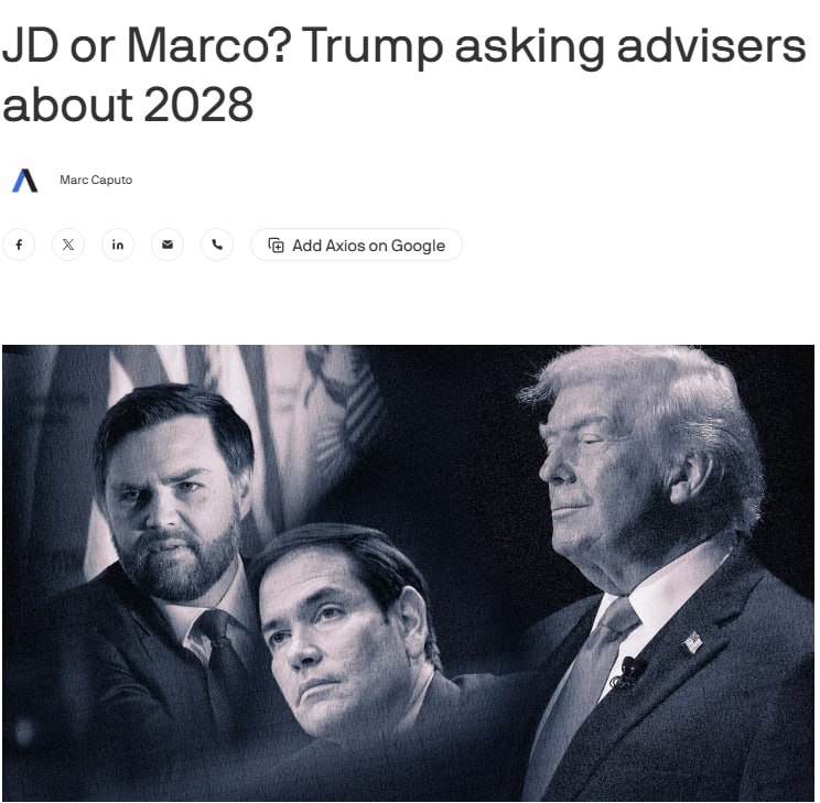 Марко Рубио и Джей Ди Вэнс могут стать потенциальными преемниками Дональда Трампа, пишет Axios со ссылкой на источники. По их словам, разговоры об этом стали чаще. Все пять собеседников, поделившихся содержанием бесед с Трампом, предупредили, что частая похвала президентом Рубио не связана с охлаждением Трампа к Вэнсу. «Мечта президента на 2028 год – это тандем Вэнс – Рубио, – и, чтобы было ясно, Вэнс во главе… Но был бы Трамп доволен тандемом Рубио – Вэнс? Безусловно», – сказал советник президента. Как пишет портал, у Вэнса есть политические советники, которые составят костяк его президентской кампании, если он будет баллотироваться на пост президента в 2028 году. Однако у Рубио такой инфраструктуры нет, но он говорил, что поддержит кандидатуру Вэнса. «Если Джей Ди Вэнс будет баллотироваться в президенты, он станет нашим кандидатом, и я буду одним из первых, кто его поддержит», – сказал Рубио в интервью в 2025 году. Сайт "Страна" | X/Twitter | Прислать новость/фото/видео | Реклама на канале | Помощь