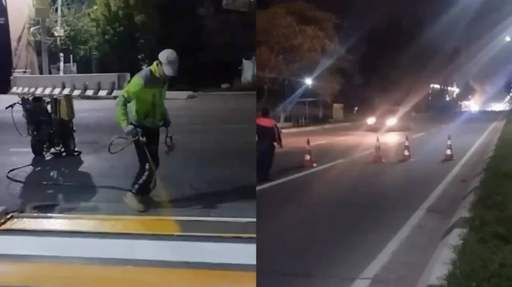 Ночной ремонт закончился разлитой краской на дороге. Рабочие красили пешеходный переход, когда по дороге проезжала машина. Из-за тёмного времени суток водитель, вероятно, не заметил банку с краской и наехал на неё. В результате краска разлилась по проезжей части, превратив участок дороги в неожиданно яркое пятно.