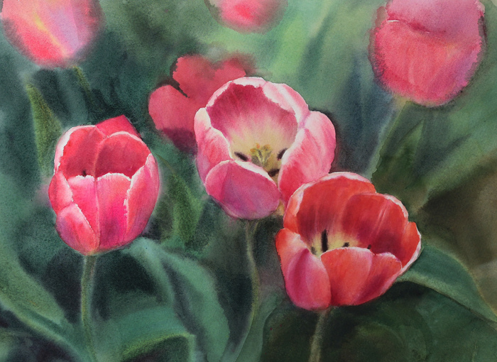 Тюльпаны. Акварель. Розовые тюльпанчики, 40*30 см, акварель