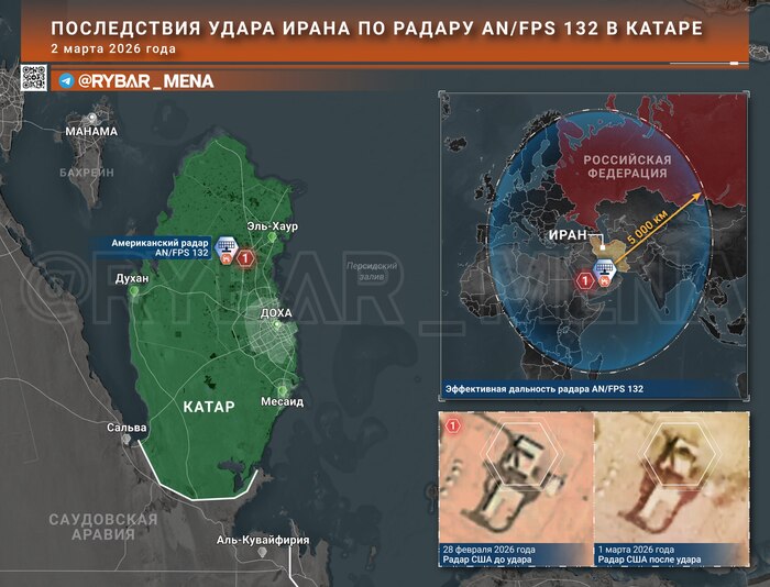 Самый чувствительный удар Ирана. На катарской базе Аль-Удейд был поражен радар AN/FPS-132 ценой в $1 млрд. Этот объект — один из ключевых узлов системы ПРО США, который «закрывает» огромный сектор от Европы до Индийского океана. В мире всего шесть AN/FPS-132: кроме Штатов, они также есть в Британии и Гренландии. О технической возможности станции в Аль-Удейде говорит хотя бы то, что она могла обнаруживать пуски ракет на дальности в свыше пяти тысяч километров, в том числе — с территории России. Не говоря уже про вз...