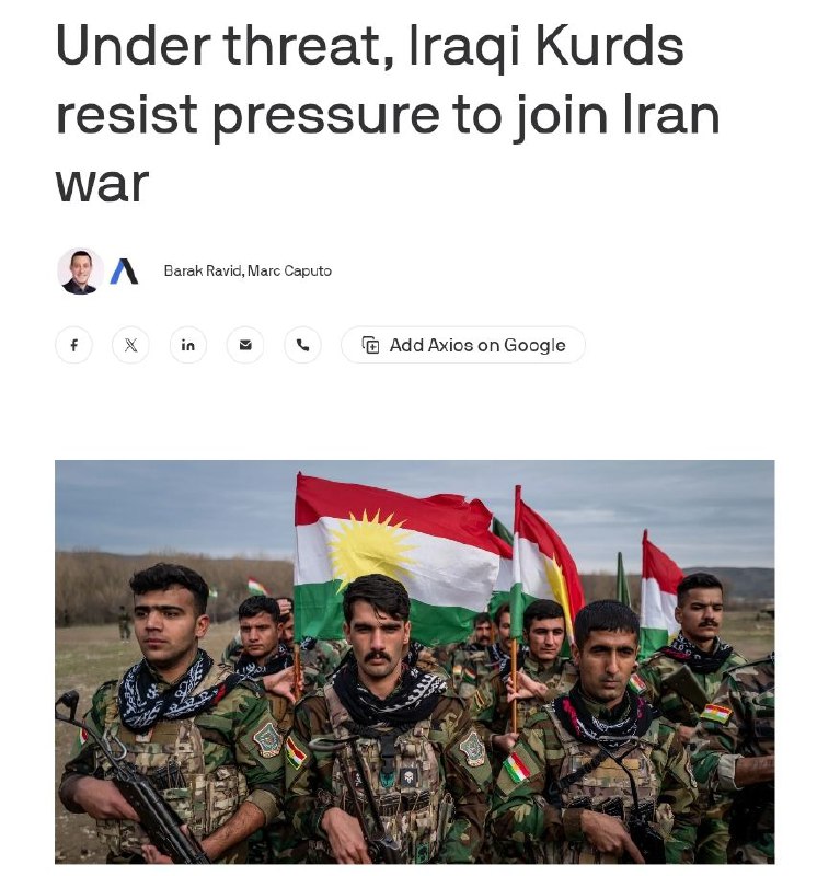 Иракские курды решили сохранять нейтралитет в войне вокруг Ирана, сообщает Axios со ссылкой на представителей регионального правительства Курдистана. По их словам, одна из причин — недоверие к США и опасения, что Вашингтон может в какой-то момент отказаться от поддержки. "У нас есть проблемы с доверием, возникшие в прошлом, и мы не хотим в это вмешиваться. Кто будет нас защищать, если иранский режим в итоге выживет?" — заявили курдские чиновники. Власти региона также сомневаются в перспективах возможной смены власти в Иране. "Безусловно, мы сохраняем нейтралитет, потому что для нас нет ясности относительно политики США. Это полная смена режима? Или просто смена персонала?" — отметил представитель правительства Курдистана. По его словам, "смена режима невозможна без присутствия войск на местах, и, по нашей оценке, США не направляют туда войска". Еще один высокопоставленный чиновник подчеркнул, что "курды не должны быть острием копья в этом конфликте". Иракские курды также говорят, что их регион практически беззащитен перед возможными ударами со стороны Ирана: "Им не нужны гиперзвуковые ракеты, чтобы нанести нам вред. 200 беспилотников 'Шахед' могут причинить здесь большой ущерб. У нас нет систем противовоздушной обороны".