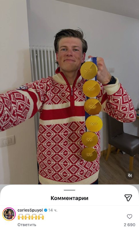 Йоханнес Клебо и его 6 золотых медалей. Неплохая поездочка в Италию вышла у норвежца. Теперь Клебо 11-кратный олимпийский чемпион и это рекорд Зимних Олимпиад (общий же рекорд по количеству золота ра олимпиадах принадлежит пловцу Майклу Фелпсу - у него 23 золотые медали). Интересно, что одним из первых Клебо в запрещенной соцсети поздравил Карлес Пуйоль.