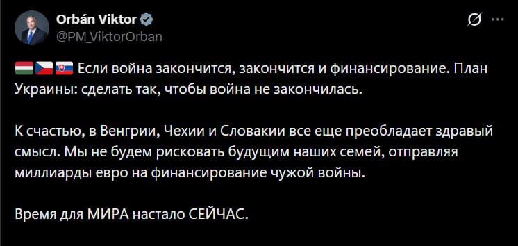 Орбан указал на истинную цель Украины в затягивании конфликта с Россией — Премьер-министр Венгрия Виктор Орбан заявил, что целью киевского режима является затягивание конфликта, несмотря на многомиллиардное финансирование со стороны Европы. Об этом он написал в соцсети Х.
