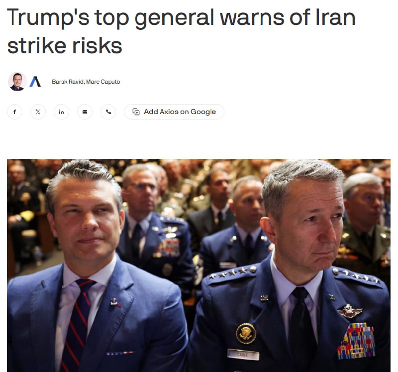 Военачальник США Дэн Кейн предупредил Трампа, что действия против Ирана могут обернуться для Вашингтона затяжным конфликтом, — Axios со ссылкой на источники. По данным портала, часть окружения президента США призывает к осторожности, однако Трамп, как утверждается, склоняется к удару. Топор Live. Подписаться
