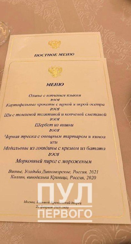 Картофельные крокеты с щукой и икрой осётра: появилось меню, которым угощали Лукашенко в Кремле: — Оливье с копчёным языком; — Картофельные крокеты с щукой и икрой осётра; — Щи с томлёной телятиной и копчёной сметаной; — Шербет из вишни; — Чёрная треска с овощным тартаром и киноа; — Медальоны из говядины с кремом из батата; — Морковный пирог с мороженым.