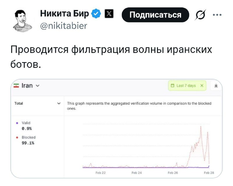 Илон Маск подключился к информационной войне против Ирана. Сотрудник X Маска заявил, что зачищает соцсеть от проиранских аккаунтов ботов. Сеть ботов из Израиля он не трогает. @banksta