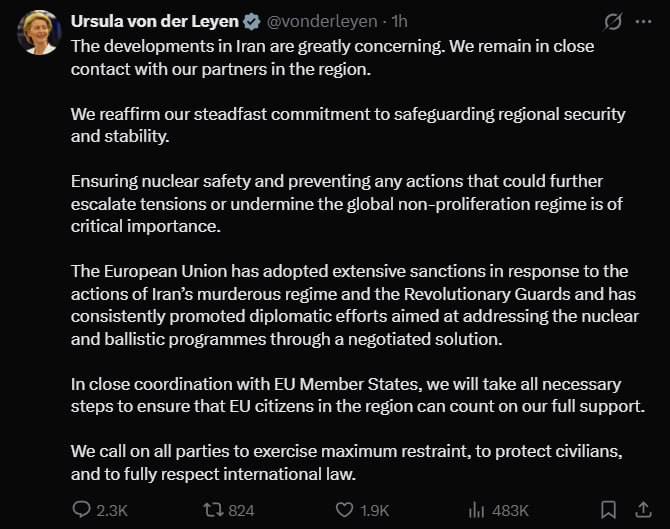 Глава Еврокомиссии Урсула фон дер Ляйен воздержалась от поддержки атаки США и Израиля на Иран.