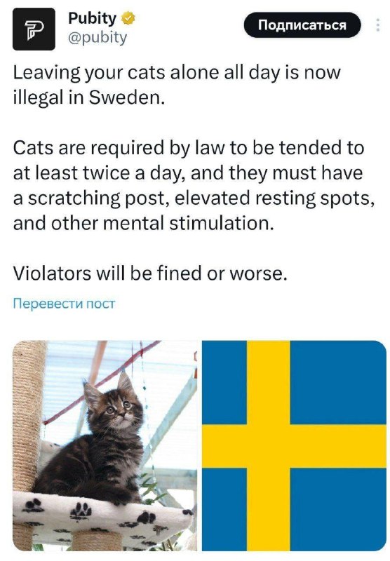 Оставлять котиков в одиночестве на весь день теперь ЗАПРЕЩЕНО в Швеции — нарушителям грозит штраф или даже тюрьма Правительство ужесточило правила ухода за домашними пушистиками. Согласно поправкам, хозяин должен играть с котиком не меньше двух раз в день Таже необходимо предоставить коту когтеточку и устроить места для отдыха. В противном случае животное может впасть в... депрессию Мнение? ️ — зато в Швеции теперь будут самые счастливые котики — слишком много требований ️ Читай Рифмы и Панчи в MAX