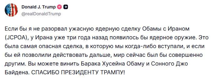 «Если бы я не разорвал ту ужасную ядерную сделку Обамы с Ираном, у Ирана уже три года назад появилось бы ядерное оружие», — Трамп