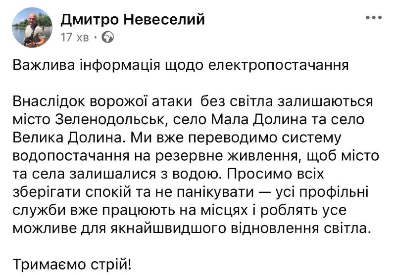 Зеленодольск и соседние села в Криворожском районе остались без света из-за обстрела, сообщает мэр города Дмитрий Невеселый.