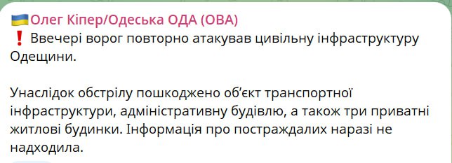 В Одесской области в результате обстрела поврежден объект транспортной инфраструктуры, административное здание, а также три частных жилых дома, сообщил глава ОВА Кипер.