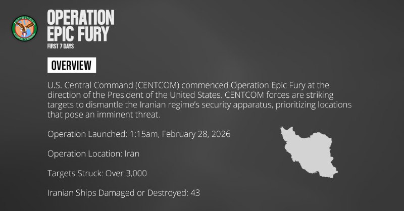 Американские войска нанесли удары по более чем 3 тыс. целей в Иране с начала военной операции, сообщило Центральное командование ВС США (CENTCOM).