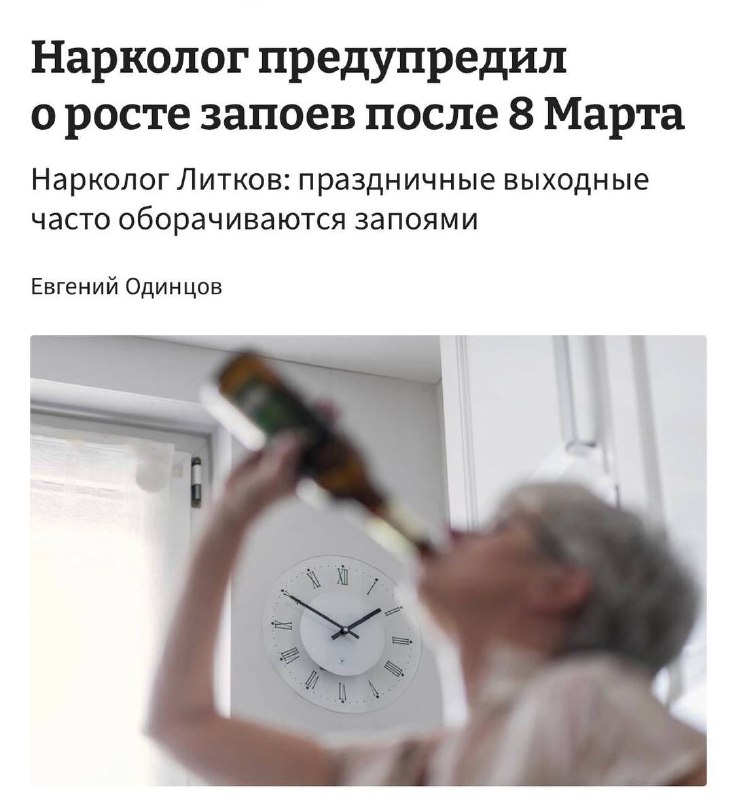 Россияне уйдут в МАССОВЫЙ ЗАПОЙ после 8 марта — предрекают наркологи Праздник и выходные часто становятся триггером для людей с алкогольной зависимостью: в такие периоды есть риск срыва и возвращения к регулярному употреблению Ты знаешь, кого предупредить... или к кому присоединиться ️ Читай Рифмы и Панчи в MAX