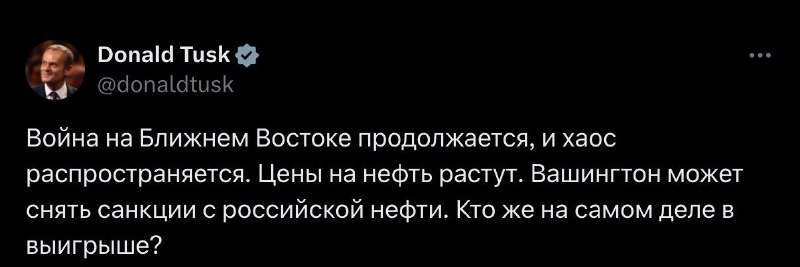 Премьер Польши Туск предположил что Россия может оказаться в выигрыше из-за войны на Ближнем Востоке: Война на Ближнем Востоке продолжается, хаос распространяется. Цены на нефть растут. Вашингтон может снять санкции с российской нефти. Кто здесь настоящий победитель? — написал он в соцсети. Топор Live. Подписаться