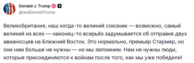 Нам не нужны люди, которые присоединяются к войнам после того, как мы уже победили, — Трамп прокомментировал намерения Великобритании направить на Ближний Восток два авианосца. Это нормально, премьер Стармер, но они нам больше не нужны — но мы запомним. Топор Live. Подписаться
