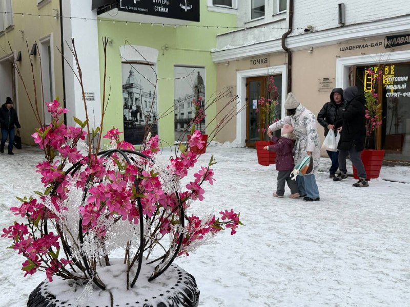 В Камергерском переулке зимние елочки сменили на весенний цветущий декор