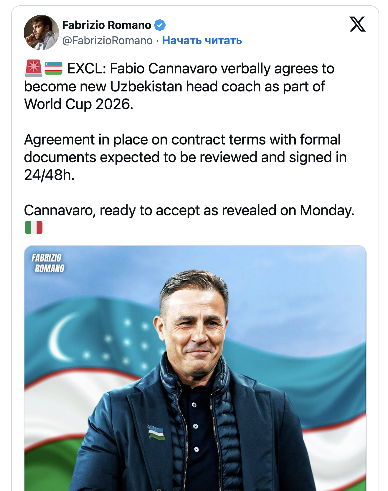 Инсайдер узнал о согласии Каннаваро возглавить сборную Узбекистана — Каннаваро в прошлом сезоне работал в загребском «Динамо». По данным Романо, он согласился на предложение сборной Узбекистана, которая в следующем году впервые сыграет на чемпионате мира