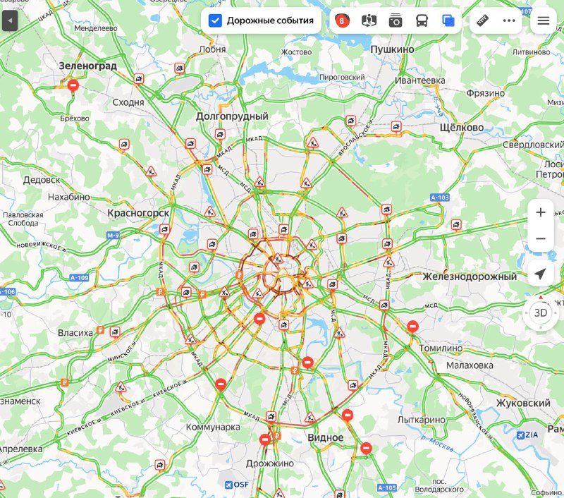 Пробки в Москве достигли восьми баллов