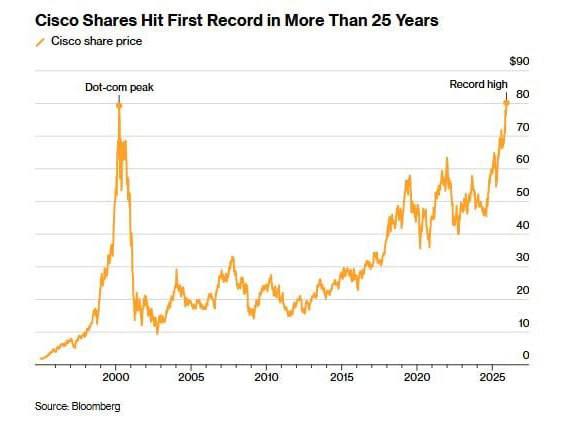 Цена акций технгиганта Cisco (CSCO) превысила уровень, достигнутый еще во время «пузыря доткомов» Спустя 25 лет инвесторы, купившие бумаги на пике в начале 2000-х, впервые вышли хотя бы в ноль. Акции выросли на 0,93% по итогам торгов 10 декабря, закрывшись на отметке $80,25 за бумагу. Это максимальный уровень закрытия за всю историю, предыдущий рекорд ($80,06) был установлен более 25 лет назад — 27 марта 2000 года.