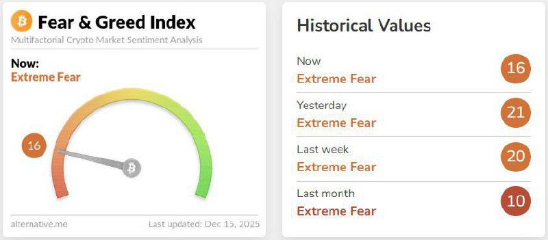Индекс страха и жадности по-прежнему остаётся в зоне экстремального страха — сейчас он на уровне 16