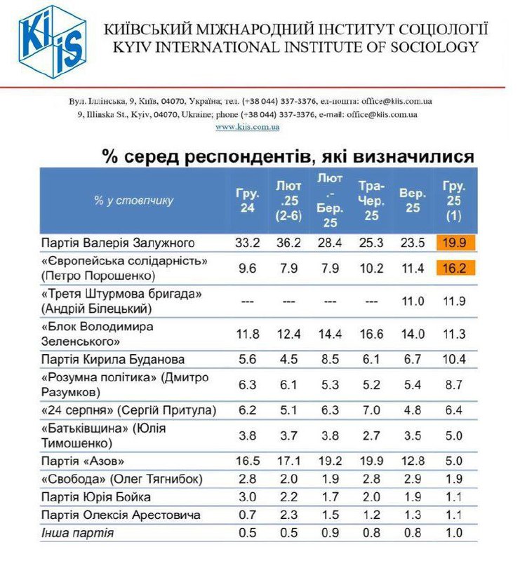 Согласно его данным, 19,9% определившихся граждан отдали бы голос за условную партию экс-главкома Залужного. На втором месте «ЕС» Порошенко (16,2%) замыкает топ-3 гипотетическая партия командира Третьего корпуса Белецкого «Третья штурмовая бригада» – 11,9%.