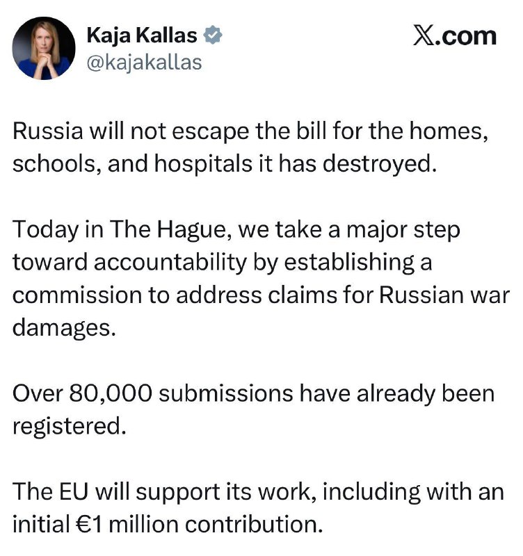 России не удастся избежать ответственности за разрушенные ею дома, школы и больницы. Сегодня в Гааге мы делаем важный шаг к привлечению к ответственности, учредив комиссию для рассмотрения претензий по поводу ущерба, причиненного Россией в ходе войны — Кая Каллас