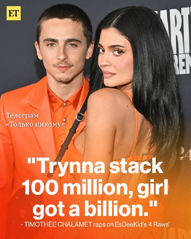 Особо не слушали, о чем там трещат Тимоти Шаламе и EsDeeKid в совместном (или таки сольном) треке. А оказалось о Кайли Дженнер. «Тимоти здесь чиллит, пытается заработать 100 миллионов, ведь у моей девчонки уже миллиард». Кайли наверное польщена, хотя ей не привыкать встречаться с рэперами.