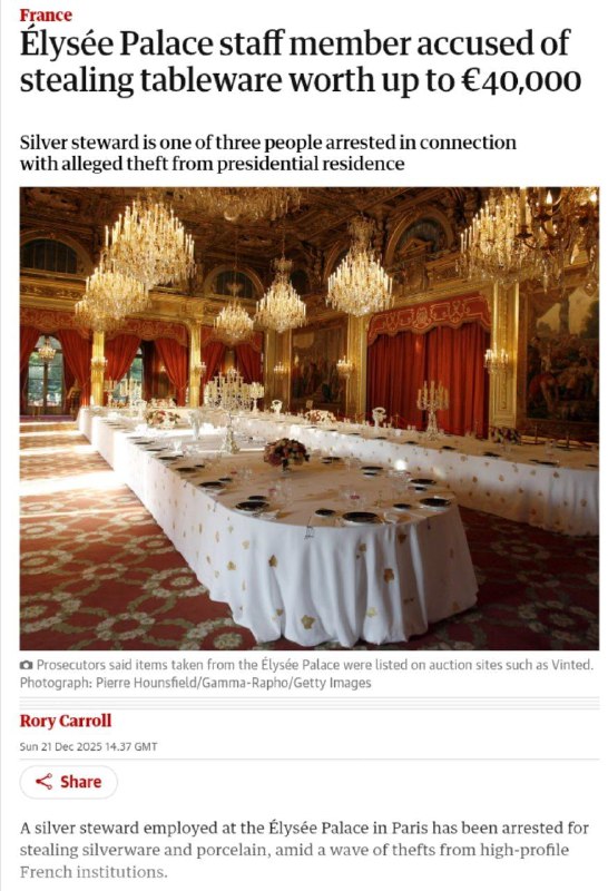 Сотрудник Елисейского дворца украл посуду у Макрона на 3,7 млн рублей — В Елисейском дворце, официальной резиденции президента Франции Эмманюэля Макрона, разгорелся скандал, связанный с хищением.. Сотрудник администрации умудрился похитить столовые приборы и фарфоровые изделия на сумму около 3,7 миллиона рублей. Об этом сообщает The Guardian.