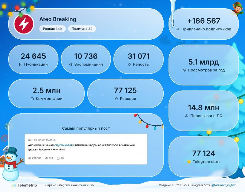 Новости в канале Ateo Breaking набрали более 5 млрд просмотров и 2,5 млн комментариев.