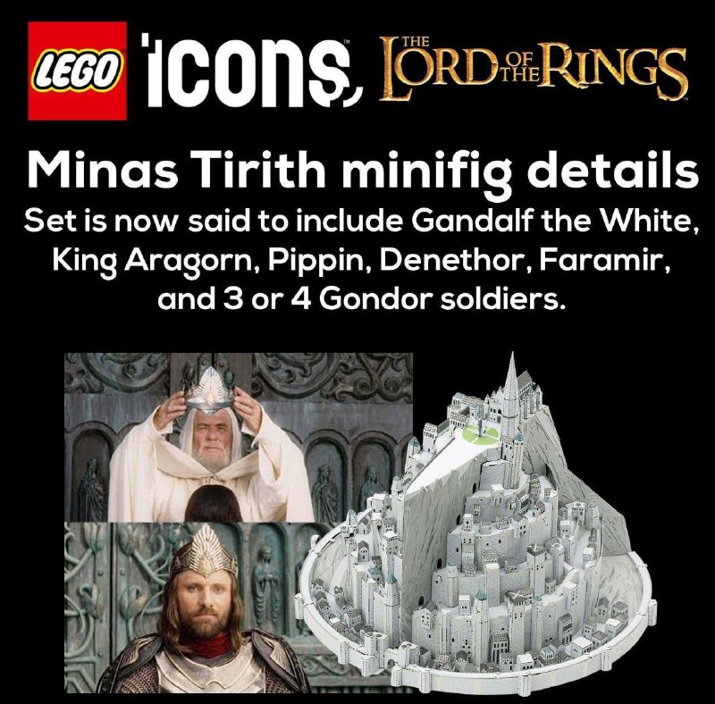 LEGO готовится выпустить крупнейший в истории набор по «Властелину колец» — город Минас Тирит Как сообщает инсайдер, это будет микромасштабная модель всей столицы Гондора, которая будет состоять из 8278 деталей. Помимо этого, в комплект также войдут минифигурки Гэндальфа, Арагорна, Пиппина, Денетора и Фарамира. Ожидаемая дата релиза — 1 июня 2026 года. ВПШ