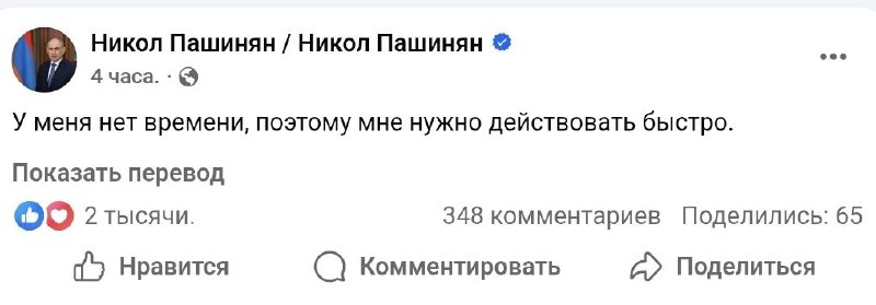 У меня нет времени, поэтому мне нужно действовать быстро, — Пашинян опубликовал загадочный пост в соцсетях. Топор Live. Подписаться