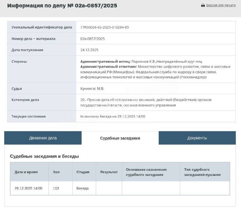 Суд принял иск против Роскомнадзора по делу о блокировке звонков в Telegram и WhatsApp*: 42 заявителя требуют признать действия ведомств нарушением конституционного права на свободу получения информации, первое заседание пройдёт 29 декабря в Таганском суде Москвы, где истцы предложат альтернативу в виде «гибридной блокировки» по желанию самих граждан и рассчитывают, что процесс станет массовым и создаст судебный прецедент, аналогичный делу Долиной — Лурье. @ecotopor