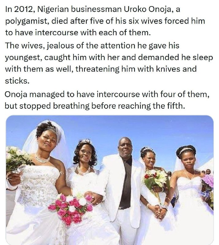 Жёны до смерти затрахали собственного мужа Один нигериец жил с шестью женщинами, но всё время спал только с самой молодой. Это страшно злило остальных жён. В 2012 году жёны в очередной раз поймали его с молодой, достали ножи и палки, угрожали ему и заставили заниматься сексом с каждой по очереди. Он выдержал четырёх женщин. Но когда очередь дошла до пятой, его сердце не выдержало — он упал и умер. Если умирать, то только так