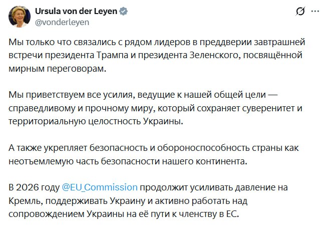 В 2026 году Еврокомиссия продолжит усиливать давление на Кремль, поддерживать Украину и активно сопровождать её на пути к членству в ЕС, — глава ЕК Урсула фон дер Ляйен.