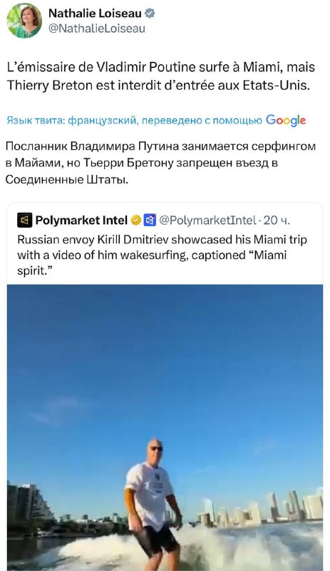 Депутаты Европарламента разозлились на то, что пока им запрещён въезд в США, спецпредставитель Путина Кирилл Дмитриев спокойно катается на серфе в Майами под русскую музыку.